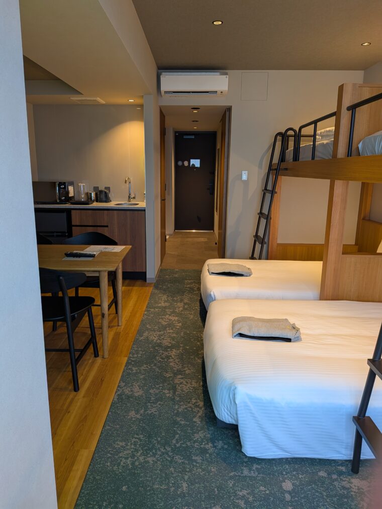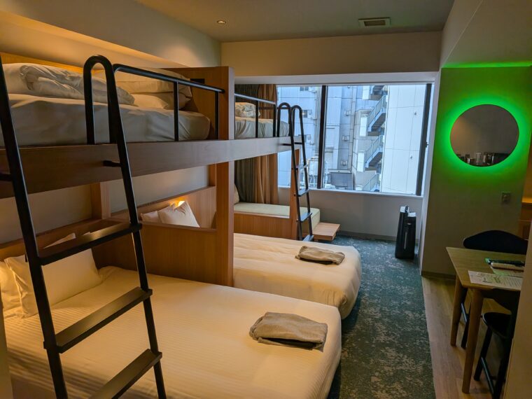 扉を開けると、大きな窓(フタミ商事も見えます)と、2段ベッドを備えたワクワク感のある客室が現れました。最大4人まで宿泊できるので、家族旅行や友人同士の利用にもぴったり。わが家の子供たちも、二段ベッドに大喜びでした。