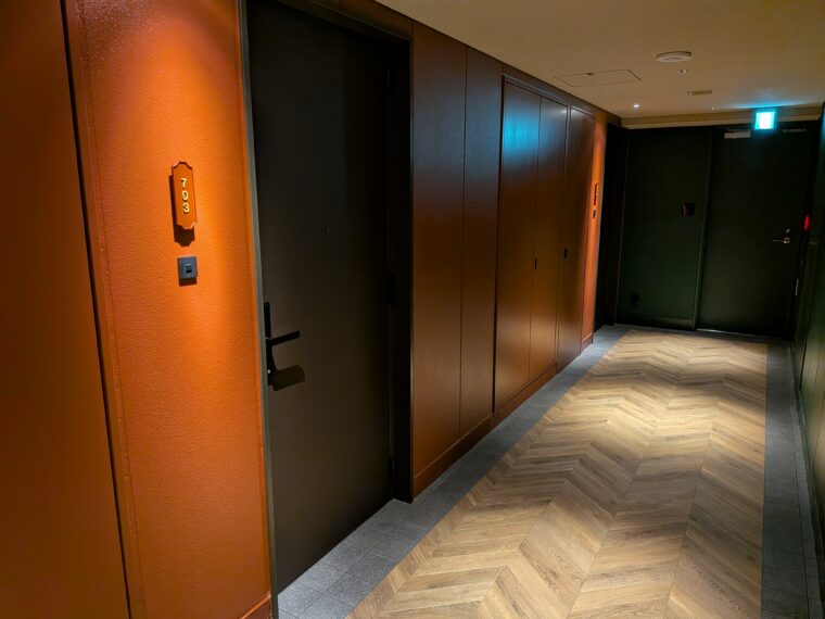 客室へと続く廊下は落ち着いた照明に照らされ、重厚感のあるオレンジやグリーンの塗装が深みを感じさせます。