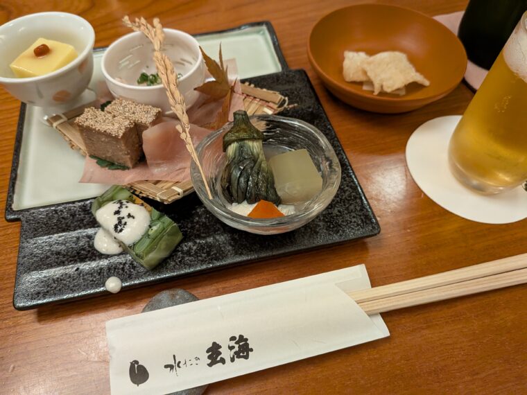 前菜は季節を感じる盛り合わせ。胡麻豆腐や焼き茄子、彩り豊かな小鉢が並び、目にも楽しい一皿。