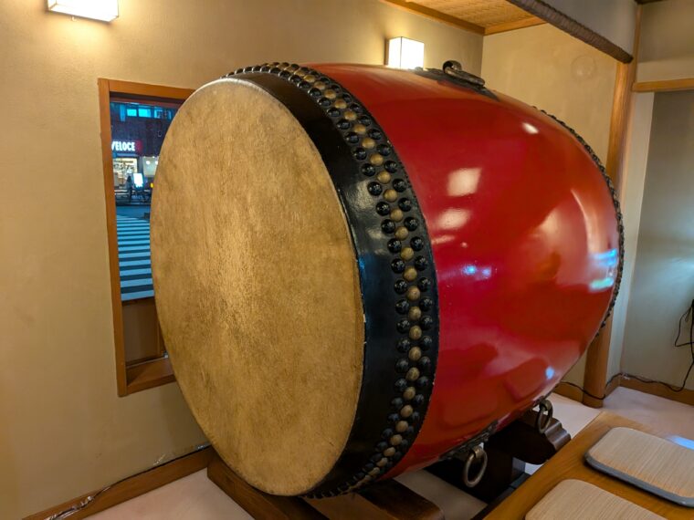 夕食はホテルから歩いて数分の「水たき玄海」へ。創業から90年以上続く老舗で、玄関には迫力ある大太鼓が出迎えてくれます。