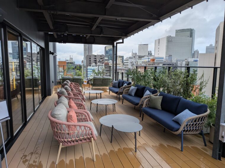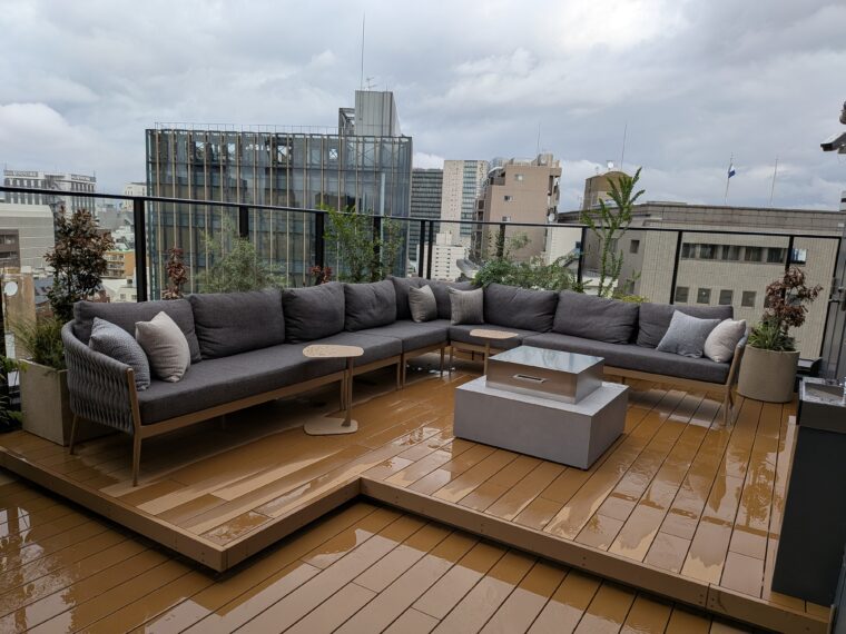 ドリンクコーナーの横にある屋上テラスへ。コーヒーを片手に過ごそうと思ったものの、あいにくの雨・・・それでも広々としたソファが並ぶ空間は、街の喧騒を忘れさせるような開放感があります。