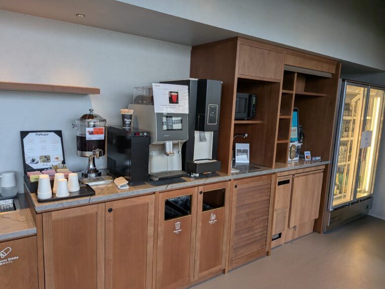 翌朝は、11階カウンター横にある宿泊者専用のドリンクコーナーへ。コーヒーや紅茶を自由に楽しめます。奥のショーケースにはビールやワイン等も並び、開業後には購入できる予定とのこと。電子レンジも備わっているので、軽食や買ってきたものを温めるのに便利です。