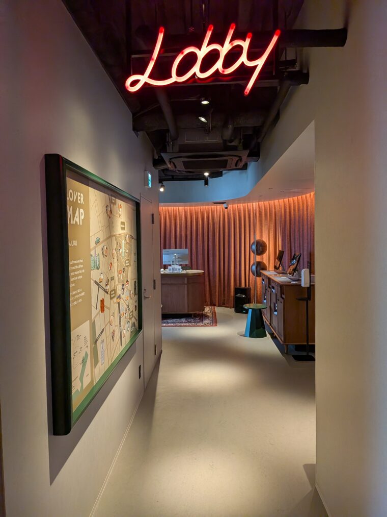 11階に上がり「Lobby」と描かれた赤いネオンサインをくぐると、木目調のカウンターとカーテンに包まれた受付スペースへ。高級感の中にもDJブースなど遊び心があり、新宿の名所マップ、壁面に施されたアートもいいアクセントになっていました。
