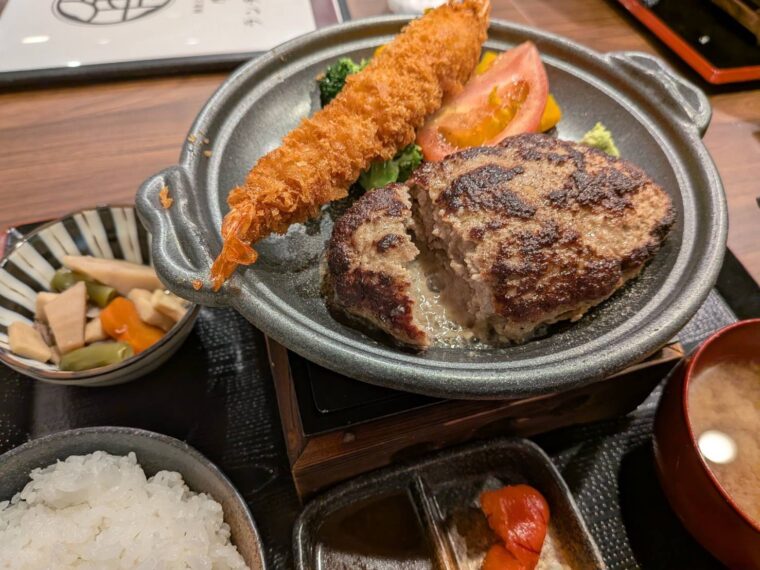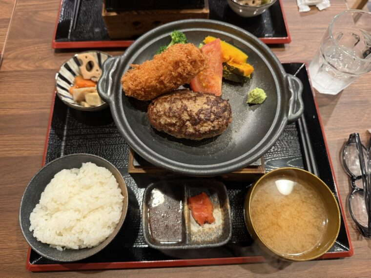 牛時の魅力は、固形燃料が仕込まれた鉄板スタイル。最後まで熱々で食べられる工夫がされている。運ばれてきた瞬間のジュウジュウという十分過ぎる肉汁と音と香りが、まず食欲を刺激する。ハンバーグはふっくらとした焼き上がりで、外はこんがり、中は肉汁がしっかり閉じ込められている。シンプルながら力強い味わい。そこにサクサクのホタテコロッケ。衣の軽さと中のクリーミーさのバランスが絶妙で、鉄板の上で最後まで熱を保ってくれるのが嬉しい。