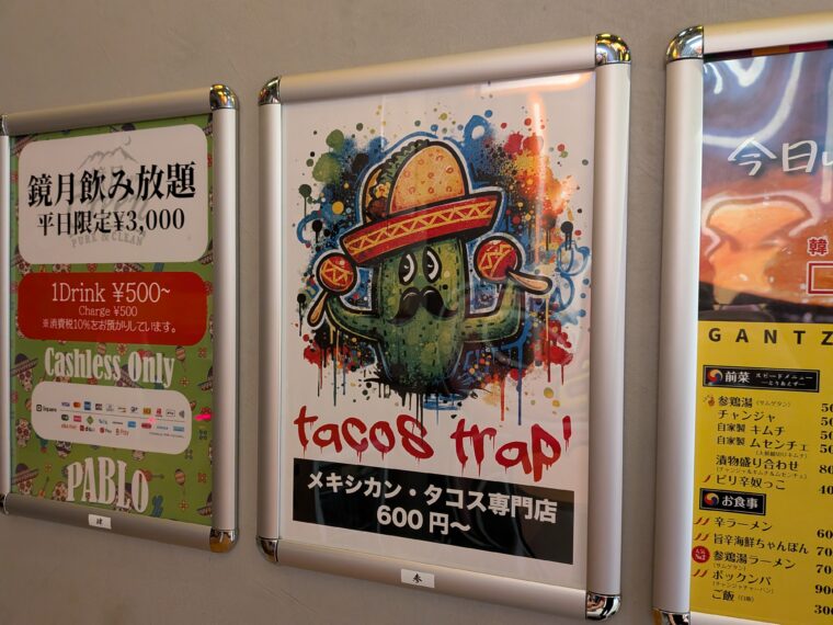 タコス帽子をかぶったサボテンおじさんが印象的な入口の案内板。カラフルなデザインからも、楽しいお店の雰囲気が伝わってきます。