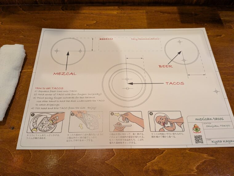 テーブルに着くと、まずタコスの食べ方等が書かれたランチョンマットが置かれます。初めての方でも安心して楽しめる工夫がされていて、私のようなタコス初心者への気配りがありがたい。
