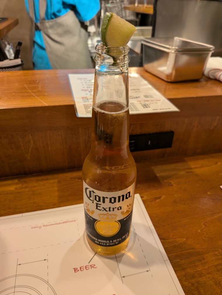 メキシカンといえば、まずはコロナビールで乾杯。ライムを軽く絞って飲む一杯は、タコスとの相性も抜群です。