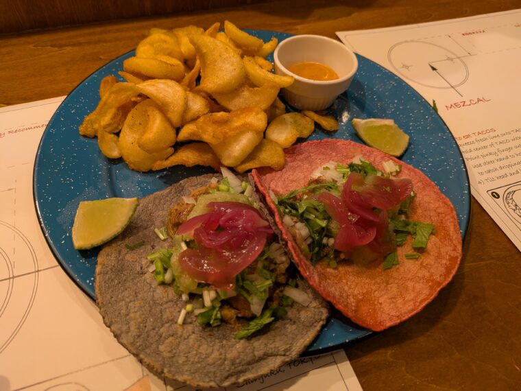タコスはビーフとチキン、魔法のフライドポテトを注文。色鮮やかなトルティーヤに、たっぷりの具材とピクルスのアクセントが効いています。本場メキシコと同じトウモロコシ粉の生地をその場で伸ばして提供され、香ばしく風味豊かでとてもおいしい。スパイスの効いたフライドポテトは、名前の通り一口食べたら止まらない魔法にかかります(笑)