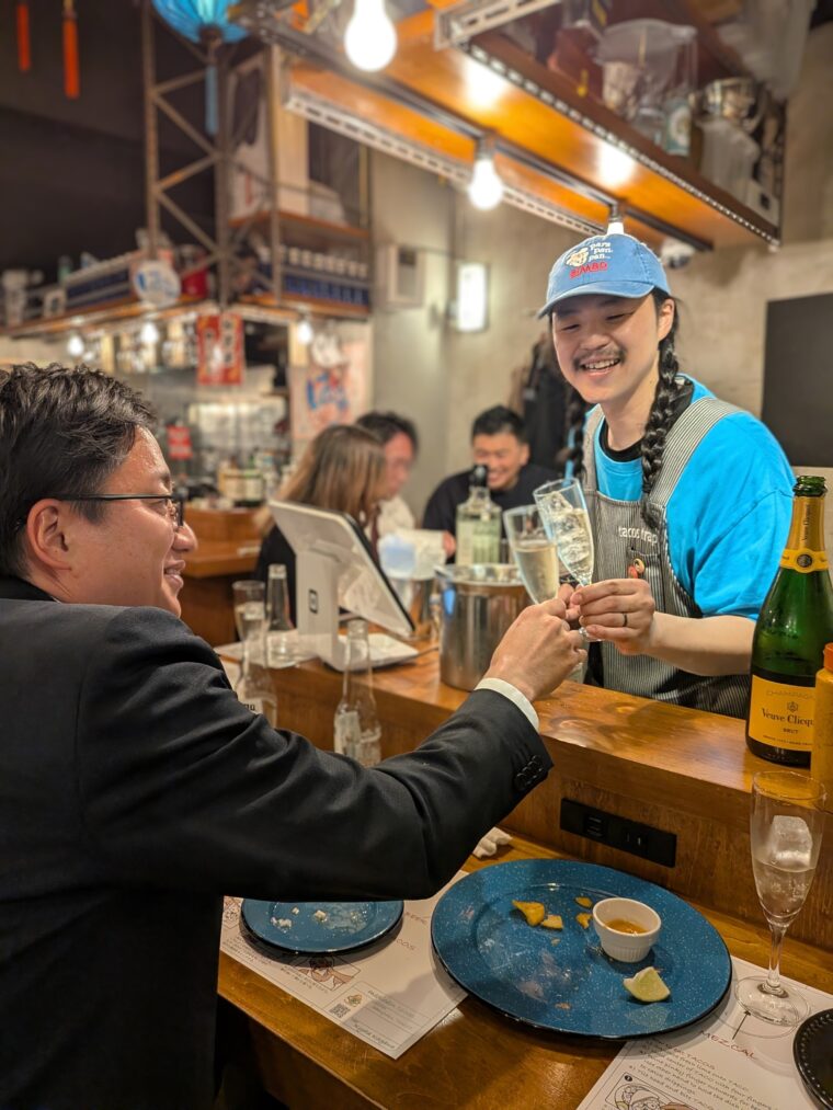 メニューの裏にさりげなくシャンパンメニューが…というわけで、店長の“キヨタカ”さんとお祝いの乾杯。オープンおめでとうございます!笑顔あふれる店内で、楽しい時間を過ごさせていただきました。