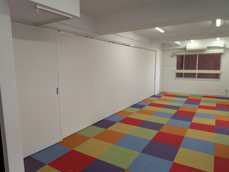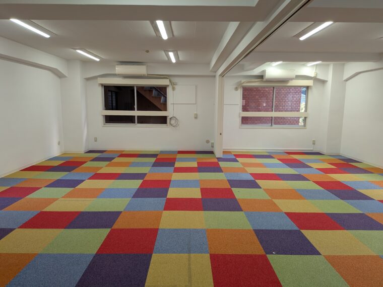 ドアを開けると、想像以上に広がる大きな空間。このカラフルなタイルカーペット、「刺さる人にはきっと刺さるはず!」ということで、一先ずこのまま募集しちゃいます。