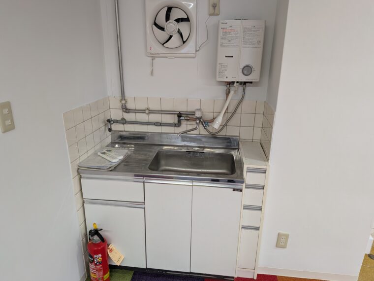 給湯器付きのミニキッチン。白を基調としたシンプルなデザインで、空間の雰囲気に馴染んでいます。そして右の隙間収納(残置物)のピッタリ具合がすごい!これこそシンデレラフィット!