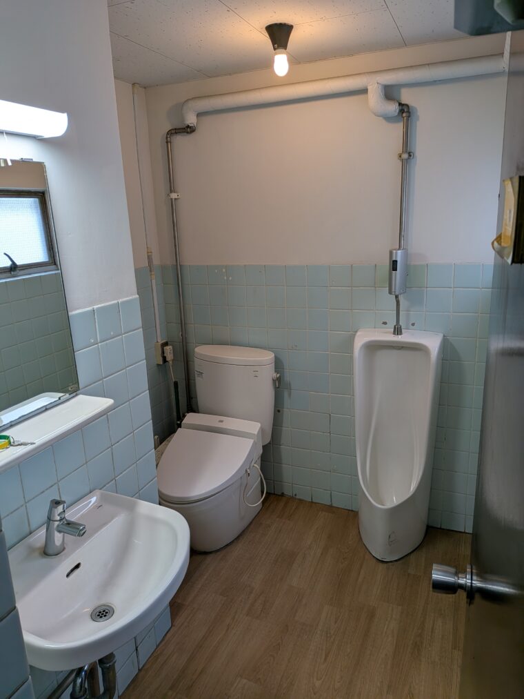 一度階段室に出て、もう一つの黒い扉を開けると専用トイレがあります。小便器の掃除は結構手間かもしれませんが、男子にはやっぱりうれしい設備です。