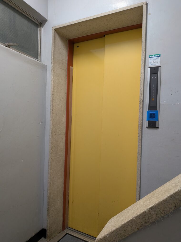 黄色の扉がレトロかわいいエレベーター。乗っても降りても踊り場なので、毎回階段を何段かは上がったり下がったりしなくてはならない。重たい荷物の搬入搬出は大変ですが、日常の使い勝手には特に不便ありません。